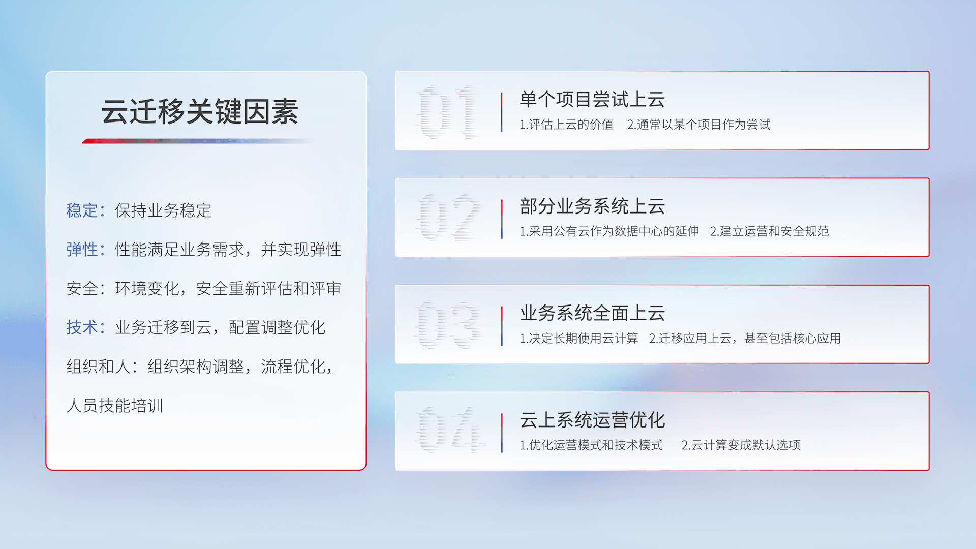 结合实际业务,,,,从规划设计、、、、云平台选型、、云原生改造、、数据迁移、、集成交付,,,,迁移全过程为客户识别最佳上云路径,,,做好风险识别管理,,,设计网络架构、、、、身份权限、、、安全审计合规、、、、操作审计、、、日志审计、、监控告警策略、、多站点容灾设计等,,,,对云上基础设施进行整体规划,,,,提升IT治理水平,,,以满足弹性、、、高可用、、、高性能的需求。。