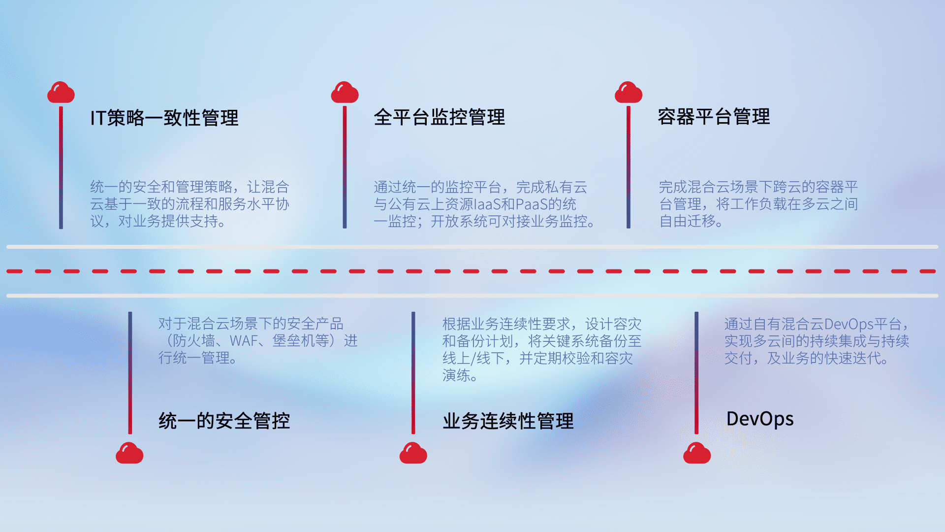 通过多云纳管,,,,以统一的资源数据模型把客户的云资源进行抽象和封装,,,,进而实现对多云资源的统一操作,,,保障云资源管理的可靠性、、、稳定性与可用性。。量身定制化运维内容,,配置、、、开发运维、、补丁管理、、、、备份、、、监控、、、、认证和访问管理、、审计和日常巡检等,,保障在用云过程中的可靠度,,,,稳定度以及高可用率。。