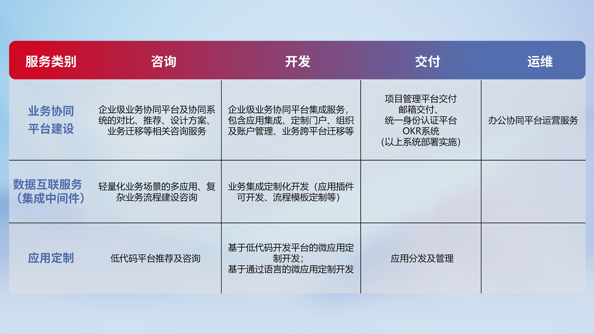 针对钉钉、、企微、、IDaas等平台级产品提供产品的规划、、、方案、、、交付、、、、定制化开发等服务,,,实现如统一协同办公、、智能客户服务、、、混合会议管理、、智能数据查询、、等业务场景,,,实现数字化转型。。。